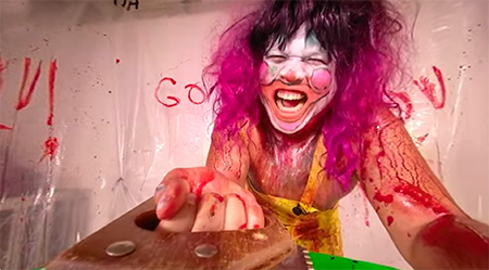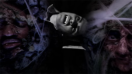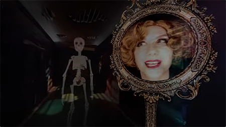 One innovation was to film the majority of Fearhouse in an enclosed miniature set. Stearns’ art directing experience drove the design and construction of a 1/6 scale set featuring the interiors of the Klunch Manor (the haunted house). Via a remote-controlled micro dolly, the 360 camera moved along long corridors and through functional doorways to banquet rooms and side chambers. One room brilliantly designed by co-director Stacy Dawson Stearns (aka Frau Klunch) featured giant vampires (played by live actors), their faces embedded into the walls. In another room, a ghostly tarot reader deals a dark forecast from beautiful animated cards painted by Abira Ali. A menacing hellmouth serves as a gateway to the inner chambers of the manor. The set was intricately detailed, resulting in a kind of hyper-realism that adds energy to the experience. No one who has seen Fearhouse has ever identified that it was miniature set. Actors were later filmed and superimposed into the space.